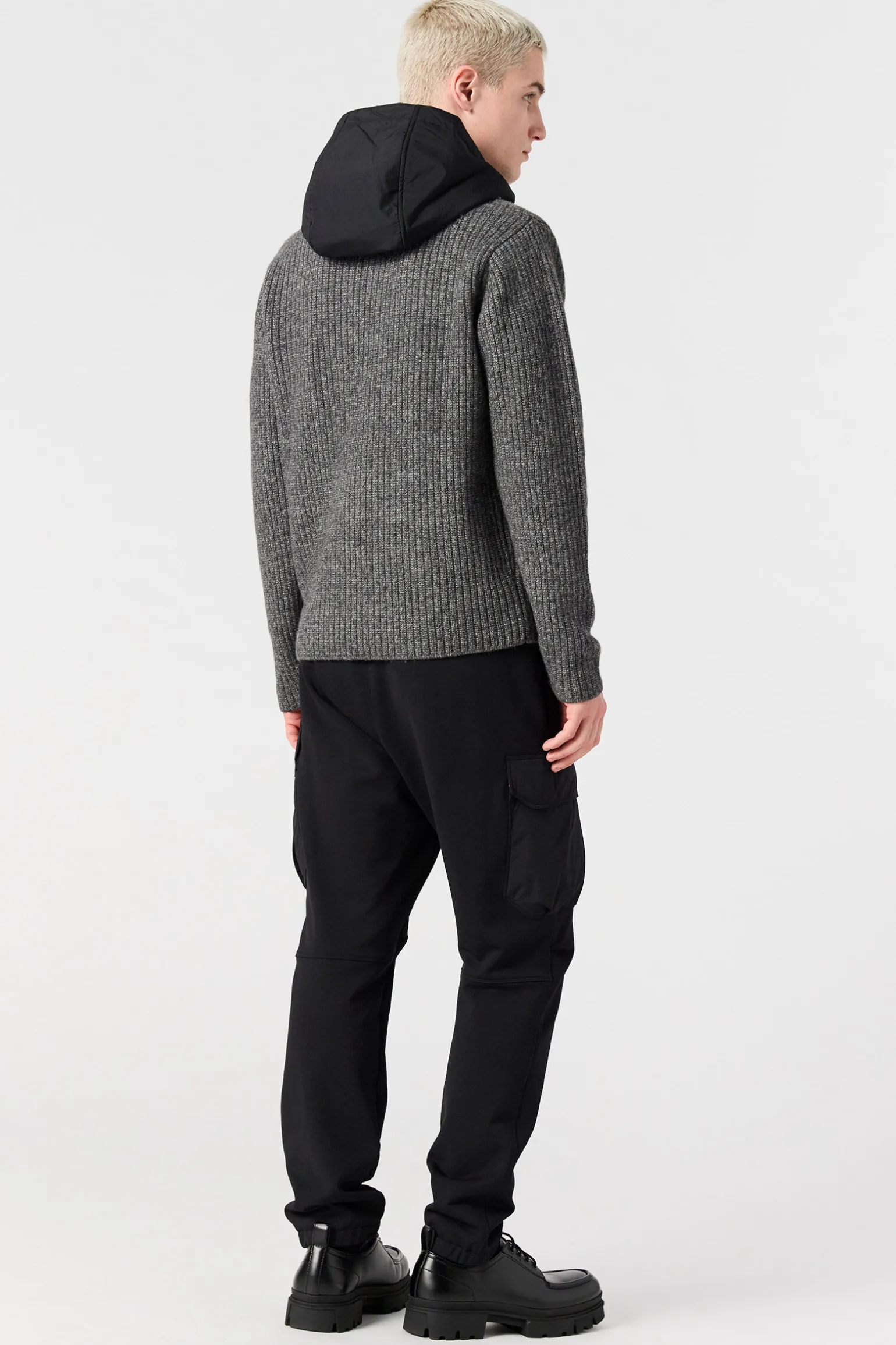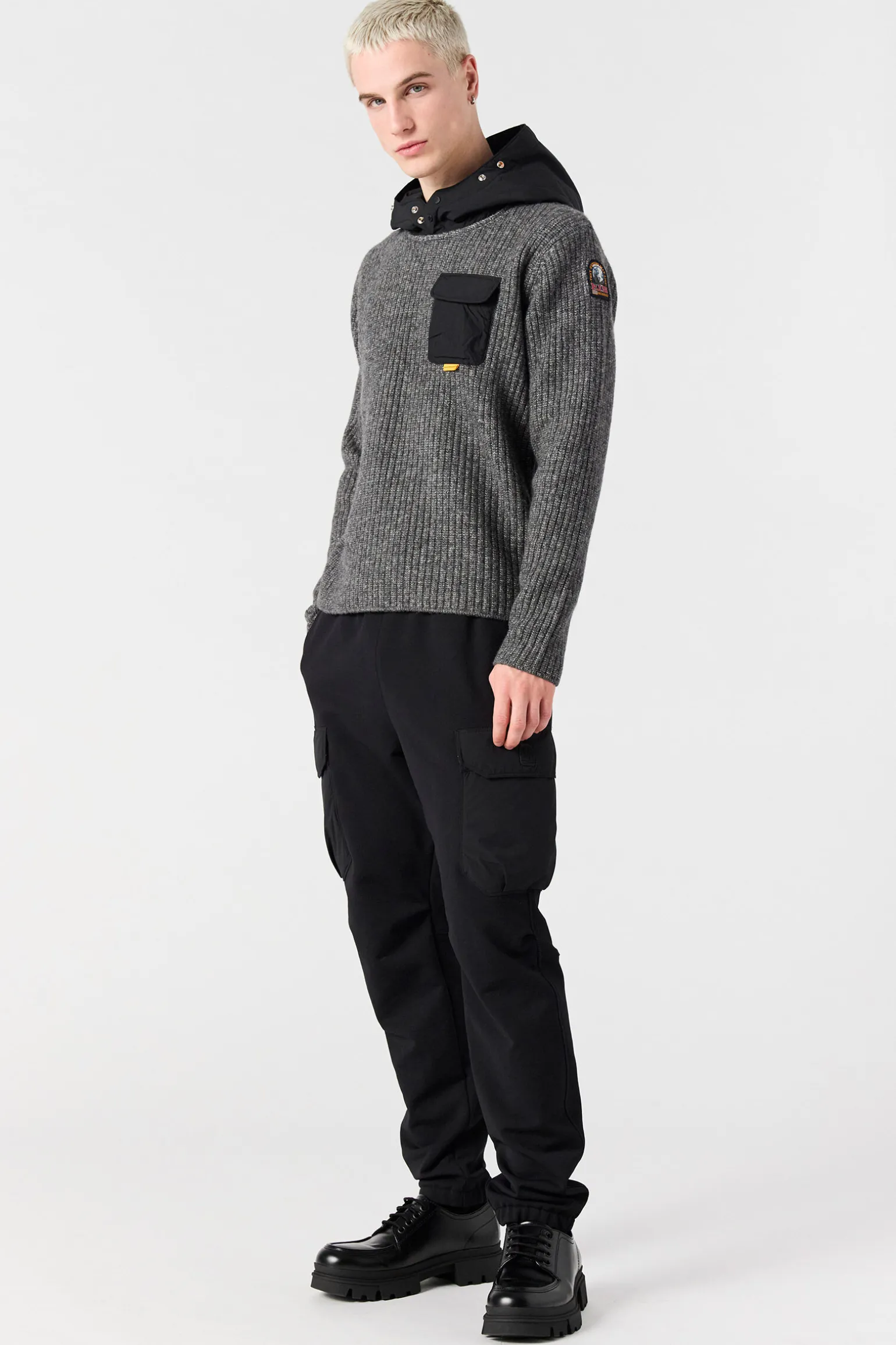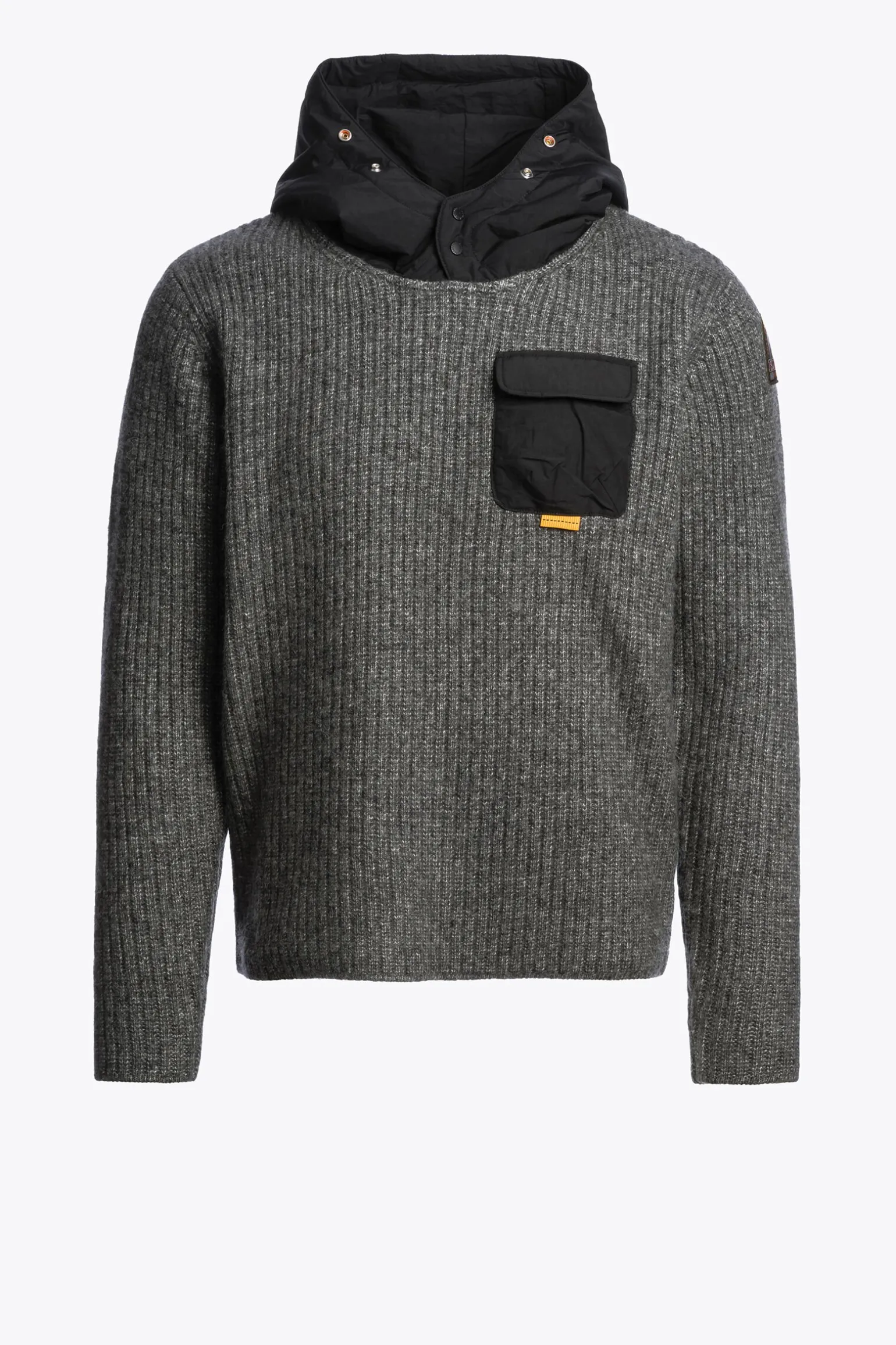 Aus der Familie Woolcot Knit kommt Notak, ein Kapuzenpullover aus Wolle und Baumwolle. Die kontrastierenden Stoffdetails verbinden Weichheit mit einem Hauch von Exzentrik.Produktcode: 25WMPMKNWK03P490541 -